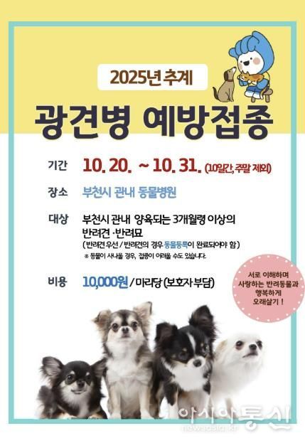 [아시아통신] 부천시는 10월 20일부터 31일까지 토요일과 일요일을 제외한 평일에 관내 동물병원 71곳에서 ‘추계 광견병 예방접종’을 실시한다.