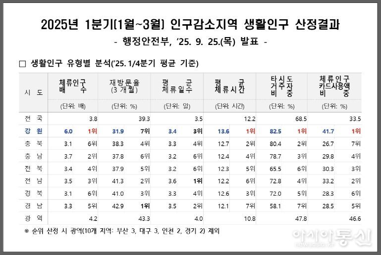 [아시아통신] 강원특별자치도는 행정안전부가 9월 25일 발표한 ‘2025년 1분기 인구감소지역 생활인구 산정 결과’에서 체류인구 총 2,826,012명으로 전국 최고 수준을 기록했다고 밝혔다.