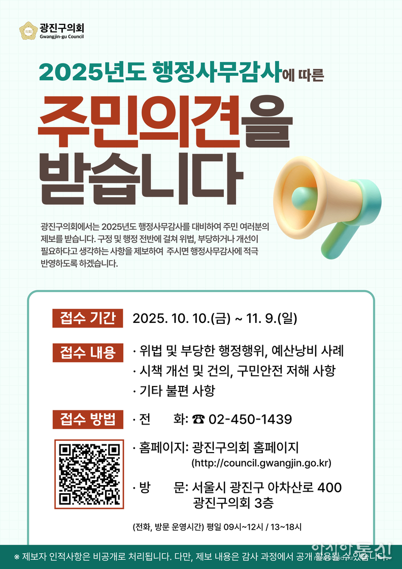 광진구의회(의장 전은혜)가 오는 11월 17일부터 진행되는 ‘2025년도 행정사무감사’를 앞두고 주민 의견을 10월 10일부터 11월 9일까지 총 31일간 접수한다.