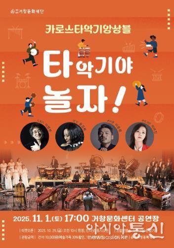 [아시아통신] (재)거창문화재단은 오는 11월 1일 토요일 오후 5시 거창문화센터 공연장에서 카로스 타악기 앙상블과 함께하는'타악기야 놀자!'를 개최한다.