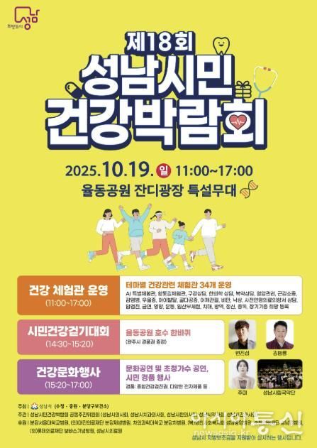 [아시아통신] ‘제18회 성남시민 건강박람회’가 오는 10월 19일 오전 11시~오후 5시 율동공원 잔디광장에서 열린다.