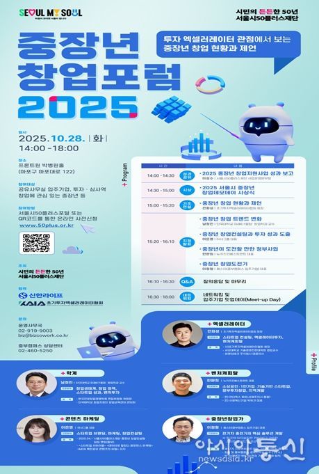 [아시아통신] 서울시가 중장년 창업지원의 성과를 시민과 공유하고, 창업 해법을 모색하기 위해'중장년 창업포럼 2025'를 개최한다.