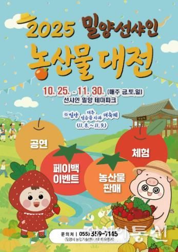 [아시아통신] 경남 밀양시는 오는 25일부터 11월 30일까지 매주 금·토·일 오전 10시부터 오후 5시까지 선샤인 밀양 테마파크에서 ‘밀양 선샤인 농산물 대전’을 개최한다고 16일 밝혔다.