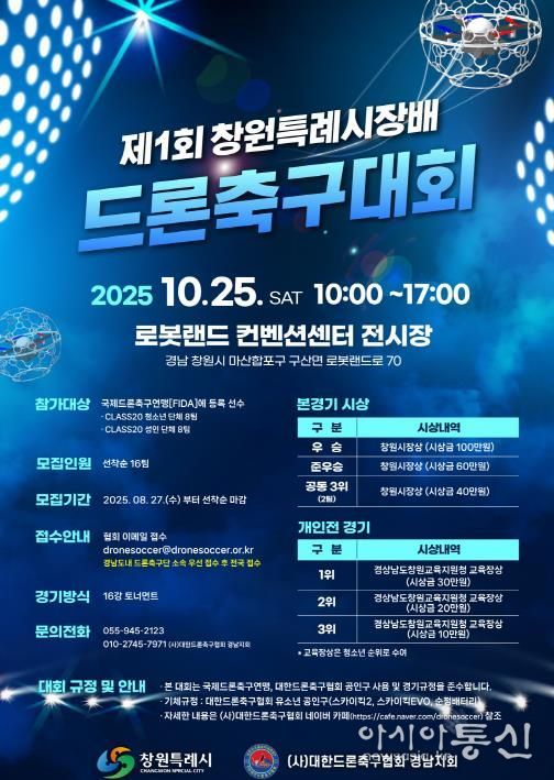 [아시아통신] 창원특례시는 10월 25일 로봇랜드 컨벤션센터에서 드론산업과 스포츠가 하나로 어우러지는 ‘제1회 창원특례시장배 드론 축구대회’를 개최한다.