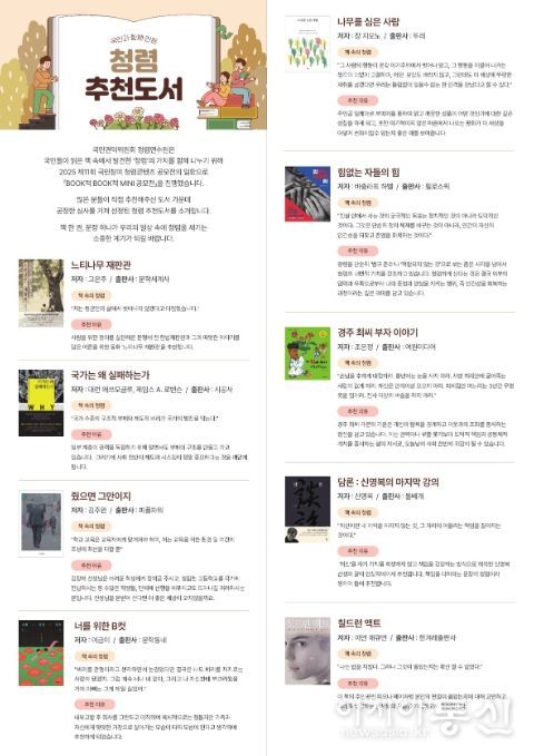 청렴연수원장은 “이번 추천 도서는 국민이 직접 추천한 도서 중 청렴의 가치를 이야기하는 책을 선정했다는 점에서 의미가 있다.”라며, “앞으로 많은 분이 일상 속에서 독서를 통해 청렴을 생각하고 실천하는 계기가 되기를 바란다.”라고 말했다.