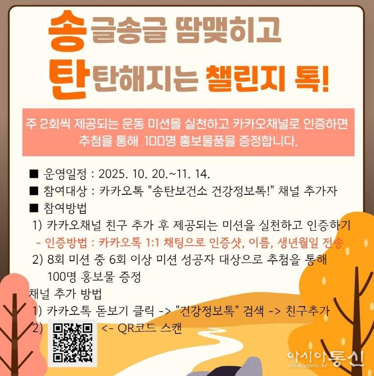 [아시아통신] 평택시 송탄보건소는 10월 20일부터 11월 14일까지 카카오톡을 활용한 ‘(송)글송글 땀 맺히고 (탄)탄해지는 챌린지 톡!’을 운영할 예정이라고 밝혔다.