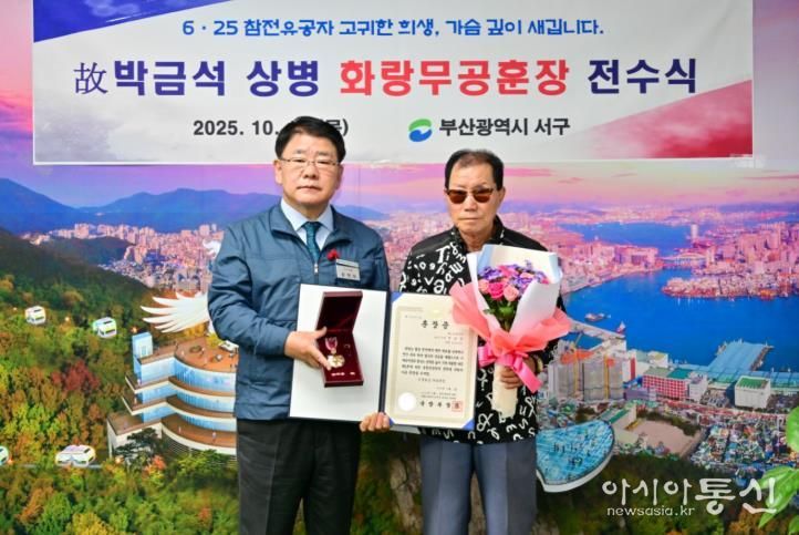 [아시아통신] 부산광역시 서구는 지난 16일, 6·25전쟁에 참전해 공을 세운 故박금석 님의 조카 박정진 씨에게 화랑무공훈장을 전수했다.