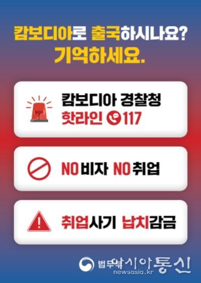 [아시아통신] 법무부는 우리 국민이 캄보디아 현지에서 취업사기 등으로 피해를 입는 사례가 지속적으로 발생함에 따라, 10월 17일부터 인천공항에서 캄보디아로 출국하는 국민이 출국 초기 단계에서부터 관련 위험을 인지할 수 있도록 안내하는 조치를 시행했다고 밝혔다.