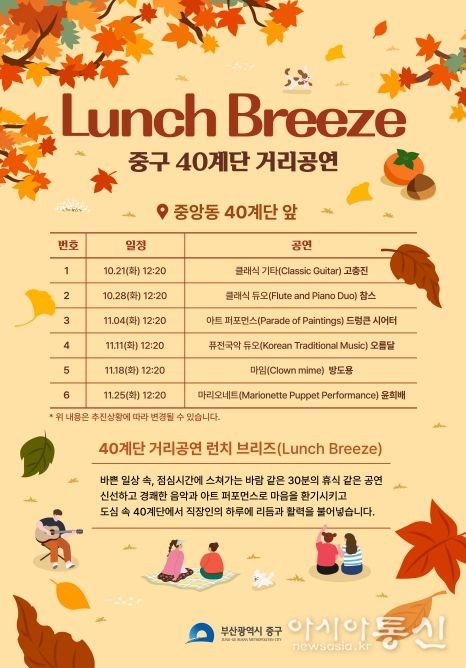 [아시아통신] 부산광역시 중구 는 오는 10월 21일부터 11월 25일까지 매주 화요일 30분간 40계단 앞에서 “40계단 거리공연[런치 브리즈(Lunch Breeze)]”을 개최한다.