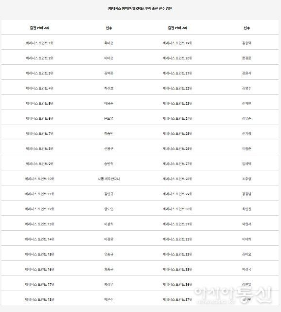 제네시스 포인트 1위 옥태훈(27.금강주택)을 비롯해 2위 이태훈(35.캐나다), 3위 김백준(24.속초아이), 4위 최진호(41.COWELL), 5위 배용준(25.CJ), 6위 문도엽(34.DB손해보험), 7위 최승빈(24.CJ), 8위 신용구(34.금강주택), 9위 송민혁(21.CJ), 10위 사돔 깨우깐자나(27.태국)까지 제네시스 포인트 TOP10 선수들과 36위 정한밀(34.경희), 37위 김동민(27.NH농협은행)까지 제네시스 포인트 상위 36명이 참가자 명단에 이름을 올렸다.