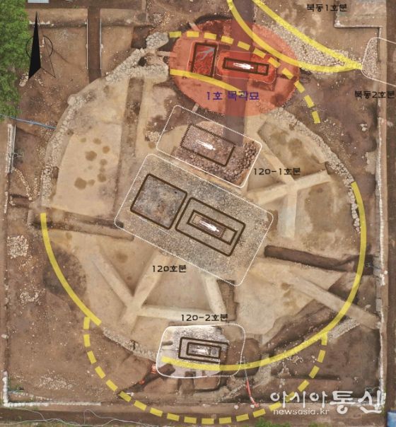 [아시아통신] 국가유산청은 경주시와 신라왕경 핵심유적 복원정비사업의 일환으로 추진하고 있는 경주 황남동 120호분 적석목곽분(돌무지 덧널무덤) 밑에서 적석목곽분 이전 시기에 먼저 조성됐던 목곽묘(덧널무덤, 경주 황남동 1호 목곽묘)를 새롭게 확인하고, 그 안에서 사람과 말의 갑옷과 투구 일체, 금동관 일부, 무덤 주인으로 추정되는 남성 장수 인골과 순장된 시종 추정 인골 등을 발굴했다.