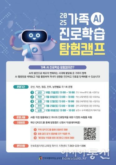[아시아통신] 전북특별자치도교육청 학부모지원센터는 오는 25일부터 12월 6일까지 매주 토요일 전주·군산·익산·남원·정읍 등 5개 권역에서 ‘2025년 아이(AI)와 함께하는 캠프’를 운영한다고 20일 밝혔다.
