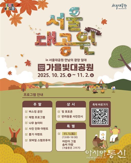 [아시아통신] 서울대공원 2025년 가을단풍축제 ‘가을빛대공원’이 10월 25일부터 11월 2일까지 서울대공원 일대에서 개최된다. 공원 전체를 가을빛으로 물들인 형형색색의 단풍을 즐길 수 있는 절호의 기회이다.