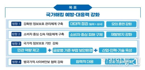'범부처 정보보호 종합대책'의 주요 추진 방향으로는 ❶국민 생활에 밀접한 핵심 IT 시스템의 대대적인 보안 점검을 추진하고, ❷소비자 중심의 사고 대응 체계 구축과 재발 방지 대책의 실효성을 강화한다. 아울러 ❸민·관 전반의 정보보호 역량을 강화하는 한편, 글로벌 기준에 부합하는 정보보호 환경 조성과 정보보호 산업·인력·기술을 육성하고, 마지막으로 ❹범국가적 사이버안보 협력 체계를 강화한다.