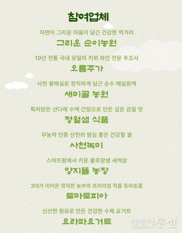 관내 8개 농가가 참여해 대표 농산물(농가별 30개 한정)을 선보인다. 주요품목은 과일, 와인, 매실액, 장류, 햅쌀, 새싹쌈, 토마토즙, 요거트 등으로 다양하다.