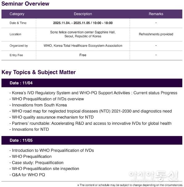 세미나에서는 WHO의 PQ 제도 개요와 평가 절차 소개 및 PQ 인증에 필요한 자료 요건과 실제 심사 사례 발표, 식약처의 국내 기업 대상 WHO-PQ 인증 지원 사업 안내 등을 통해 우리 기업의 WHO PQ 제도 이해를 돕는다. 또한 PQ 인증을 준비하는 체외진단의료기기 제조기업과 WHO 담당자 간 1:1 맞춤형 상담 세션도 함께 진행된다.