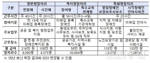 2026년 장애인일자리 지원사업(정부예산안 기준)은 2025년 3만 3,546명 대비 2,300명 확대된 3만 5,846명이며, 일반형일자리(전일제, 시간제), 복지형일자리, 특화형일자리(시각장애인안마사 파견, 발달장애인요양보호사 보조) 3개 유형으로 구분하여 시행하고 있다.