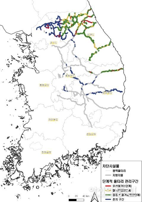 1단계 우선철거 구간(136.6km)은 생태적 가치와 연결성이 높은 설악산·소백산 국립공원 지역과 낙석방지막·옹벽 등이 있는 곳에 울타리가 중복·이중으로 설치된 지역으로 2026년부터 철거한다.