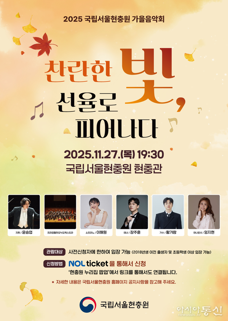 국립서울현충원(원장 윤현주)은 11월 27일(목), "찬란한 빛, 선율로 피어나다"를 주제로 가을음악회를 개최한다고 밝혔다. 공연은 국립서울현충원 현충관에서 진행되며, 오후 7시 30분부터 시작된다.