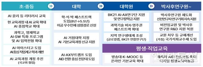 초‧중등 학생‧학부모 등을 대상으로 인공지능(AI) 교육을 실시하는 인공지능(AI) 교육지원센터를 2026년 3개 교육청에 우선 설립하고, 2028년까지 전국 17개 시‧도교육청 전체에 확대할 계획이다. 시‧도교육청-대학-기업이 함께 학교 인공지능(AI) 교육을 지원하도록 협력 체계 구축을 지원하며, 특히 학생들에게 다양한 인공지능(AI) 진로체험 기회를 제공할 예정이다.