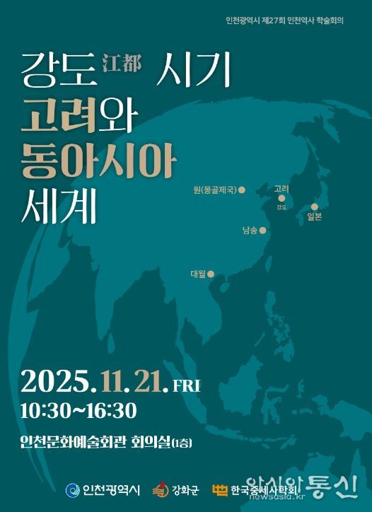 [아시아통신] 강화군은 인천광역시 및 한국중세사학회와 공동으로 오는 11월 21일 인천문화예술회관 회의실에서 ‘강도(江都) 시기 고려와 동아시아 세계’를 주제로 ‘인천역사 학술회의’를 개최한다.