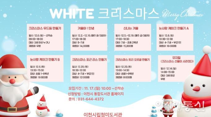 [아시아통신] 이천시 청미도서관이 다가오는 크리스마스를 맞아 가족이 함께 즐길 수 있는 다채로운 겨울 프로그램을 운영한다. 이번 프로그램은 유아부터 가족 단위 이용자까지 모두가 참여할 수 있도록 구성되어, 따뜻하고 포근한 겨울 감성 속에서 즐겁고 뜻깊은 경험을 선사할 예정이다.