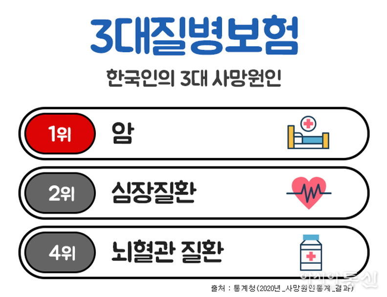 [아시아통신] 3대질병으로 일컬어지는 암, 뇌혈관질환, 심혈관질환은 한국인의 주요 사망원인에서 상위를 차지하고 있으며, 이에 대한 진단비를 집중적으로 보장해 주는 보험상품을 3대질병진단비 보험이라 할 수 있다.