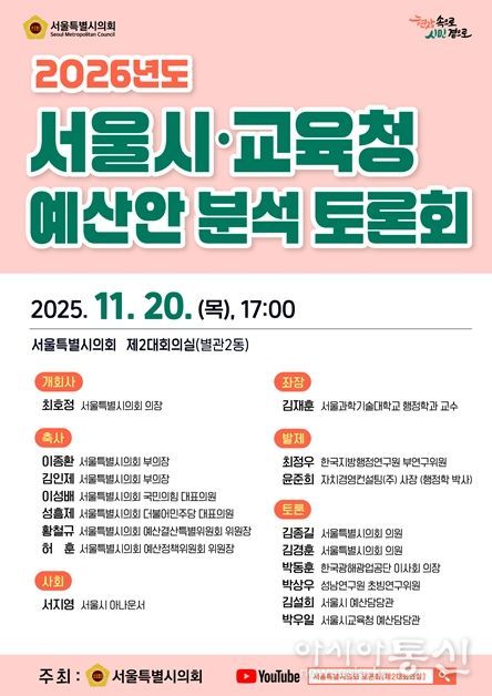 [아시아통신] 서울특별시의회는 2025년 11월 20일 오후 5시, 서울특별시의회 제2대회의실에서 '2026년도 서울시·교육청 예산안 분석 토론회'를 개최한다.