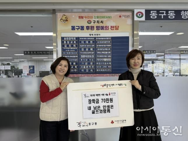 [아시아통신] 구리시 동구동 행정복지센터는 지난 18일 동구동 행정복지센터 대회의실에서 '내 남은 인생은 골프와 함께' 모임으로부터 관내 취약계층 청소년을 위한 장학금 70만 원을 기탁받았다고 밝혔다.