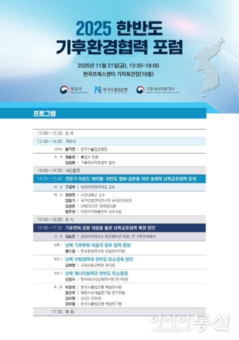 [아시아통신] 통일부는 11월 21일 오후, ‘한국프레스센터’(서울시 중구 소재)에서 '2025 한반도 기후환경협력 토론회'를 개최한다.