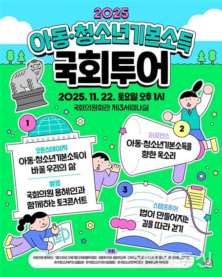 [아시아통신] 기본소득당 용혜인 의원은 오는 11월 22일 오후 1시, 국회의원회관 제3세미나실에서 '2025 아동·청소년기본소득 국회투어'를 개최한다. 이날 국회투어에는 100명이 넘는 아동·청소년·양육자·교육자가 모여 아동·청소년기본소득을 요구하고 나선다.