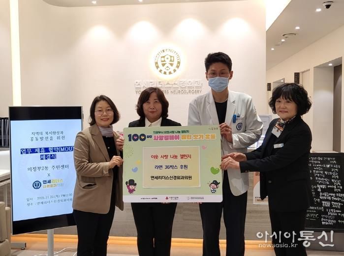 [아시아통신] 의정부시 의정부2동주민센터는 11월 24일 연세리더스 신경외과의원이 ‘100일간 사랑릴레이 배턴 잇기’에 동참해 취약계층을 위한 라면 36상자를 기부했다고 밝혔다.