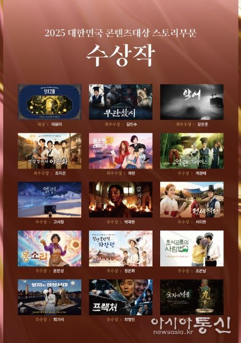 [아시아통신] 문화체육관광부는 한국콘텐츠진흥원과 함께 11월 25일 오후 5시, 코엑스(서울 강남구)에서 ‘2025 대한민국 콘텐츠 대상 스토리 부문 시상식’을 열고 수상작 15편을 시상한다.