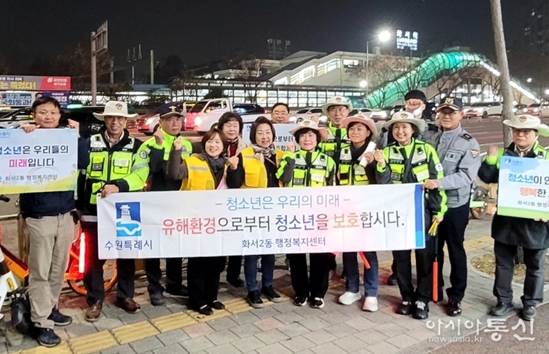 수원시 팔달구 화서2동(동장 지은아)은 11월 24일 오후 7시부터 8시까지 관내 청소년 보호를 위한 유해환경 점검 및 계도 캠페인을 펼쳤다. 이번 활동에는 청소년지도위원회, 자율방범대, 화서문지구대 경찰관 등이 참여해 민‧관 협력 체계를 강화하는 데에 뜻을 모았다.