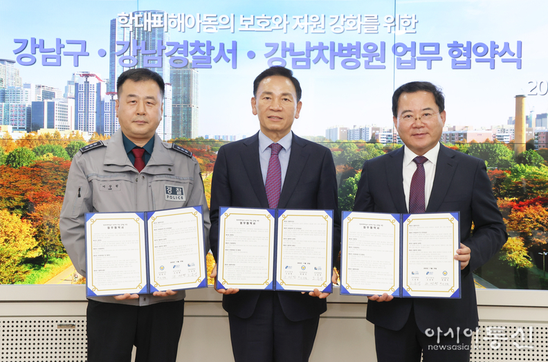 꿈이 모이는 도시, 미래를 그리는 강남구(구청장 조성명)가 11월 25일 구청에서 강남경찰서, 강남차병원과 함께 ‘아동학대 전담의료기관 지정 및 아동보호 협력체계 구축을 위한 업무협약’을 체결했다. 이번 협약은 ‘아동학대 예방의 날’(11월 19일)을 계기로 마련돼, 피해 아동에 대한 실질적 지원을 강화하는 데 방점을 두고 있다.
