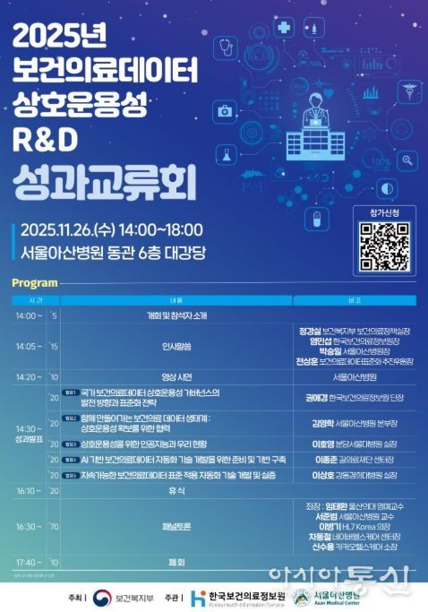 [아시아통신] 보건복지부가 주최하고 한국보건의료정보원(원장 염민섭)이 주관하는 '보건의료데이터 상호운용성 R&D 성과교류회'가 11월 26일 서울아산병원(서울 송파구 소재) 대강당에서 개최됐다.