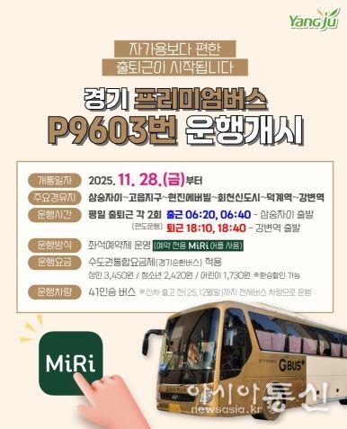 [아시아통신] 양주시 삼숭자이에서 서울 강변역까지 운행하는 경기프리미엄 버스 P9603번이 28일부터 본격 운행을 시작했다.