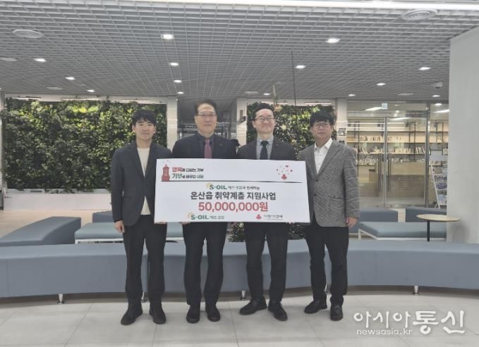 [아시아통신] S-OIL 울산공장이 5일 울주군 온산읍 행정복지센터에서 이준호 온산읍장, 박성훈 S-OIL 상무, 박광철 온산읍 지역사회보장협의체 위원장, 양호영 울산사회복지공동모금회 사무처장 등이 참석한 가운데 온산읍 취약계층 지원금 5천만원을 전달했다.