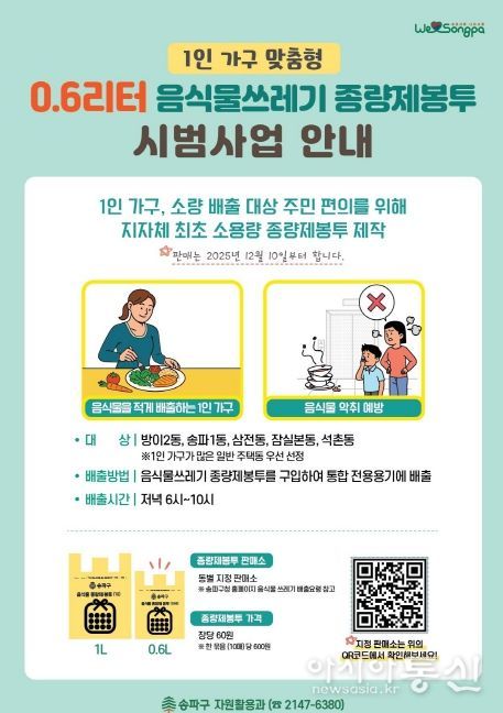 [아시아통신] 서울 송파구가 전국 지방자치단체 최초로 1인 가구에 최적화된 0.6ℓ 규격의 음식물쓰레기 종량제봉투를 오는 10일부터 시범 도입해 운영한다고 알렸다.