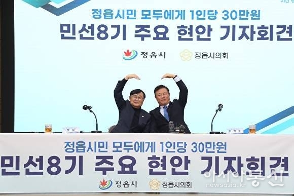 <정읍시 박일 시의장과 이학수시장이 기자회견을 마치고 퍼포먼스를 하고 있다.>