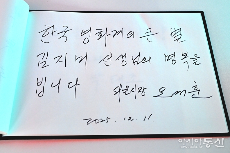 오 시장은 서울영화센터 1층 미디어월에서 상영되는 배우 김지미의 추모 영상을 시청하며 고인의 영화 인생을 되새겼다. 이어 헌화 후 방명록에 “한국 영화계의 큰 별 김지미 선생님의 명복을 빕니다”라고 남기며 애도의 마음을 전했다.