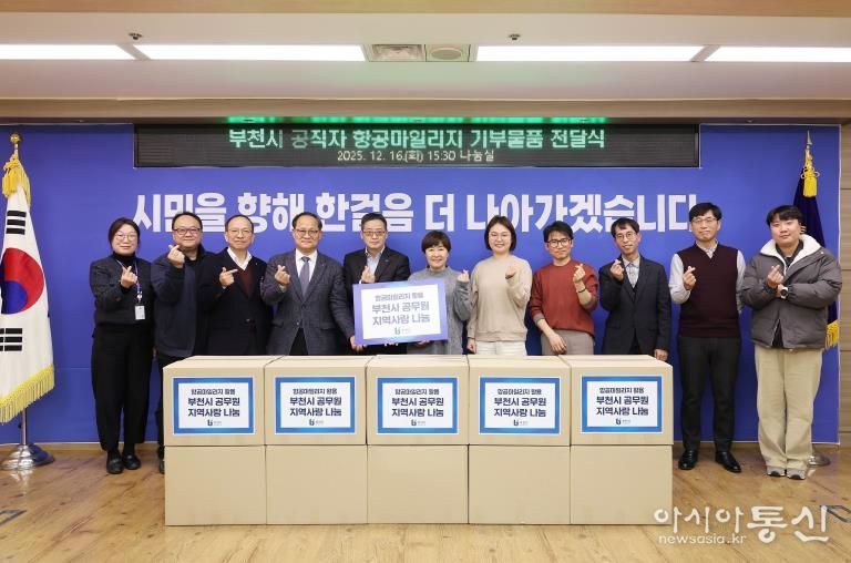 [아시아통신] 부천시는 지난 16일 직원들이 보유한 항공마일리지를 활용해 물품을 구매하고 이를 지역 복지시설에 기부하는 연말 나눔 행사를 열었다. 이번 행사는 공적 항공마일리지를 사회공헌 활동에 활용하고, 연말을 맞아 지역사회 나눔 문화 확산에 기여하기 위해 추진됐다.