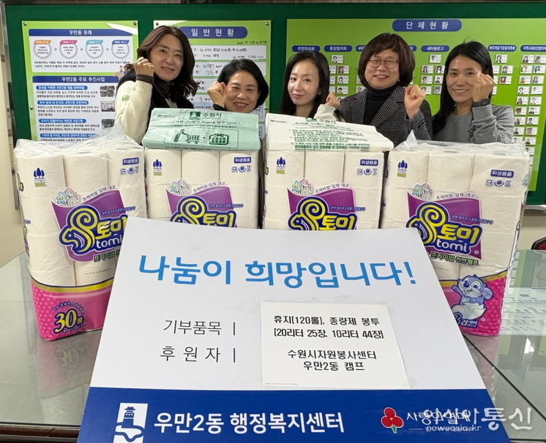 수원시 팔달구 우만2동(동장 최영문)은 지난 12일, 수원시자원봉사센터 우만2동 캠프(소속 정수연)로부터 휴지와 종량제 봉투 기부를 전달받는 뜻깊은 시간을 가졌다.