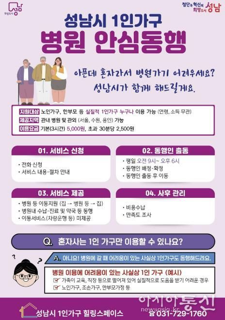 [아시아통신] 성남시는 ‘1인 가구 병원 안심 동행 서비스’ 추진을 위해 전문 인력을 기존 4명에서 5명으로 늘렸다고 22일 밝혔다.