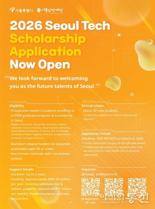 [아시아통신] 서울장학재단이 기존 개발도상국 중심이던 지원 자격을 국적 제한 없이 전면 개방하고, '2026년 서울테크스칼러십(Seoul Tech Scholarship)' 장학생 30명을 선발한다. 서울의 미래 산업을 이끌 글로벌 이공계 우수 인재를 서울로 적극 유치하기 위한 전략이다.