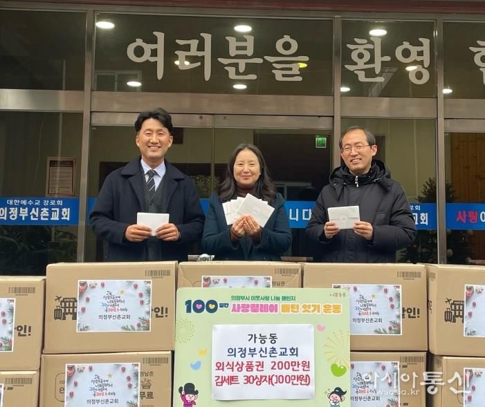[아시아통신] 의정부시 가능동주민센터는 12월 19일 의정부신촌교회가 성탄절을 맞아 외식상품권 200만 원과 김세트 100만 원 상당을 기탁하며 ‘100일간 사랑릴레이 배턴 잇기’에 동참했다고 밝혔다.