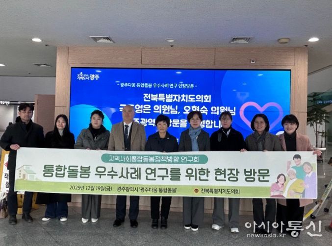 [아시아통신] 전북특별자치도의회 ‘지역사회통합돌봄정책방향 연구회’(국주영은 대표의원)가 지난 18일 지역사회 통합돌봄 선도 모델로 평가받는 광주광역시 ‘광주다움 통합돌봄’ 현장을 방문해 사례 연구를 실시했다.