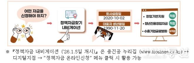 중소기업 정책자금은 중소벤처기업진흥공단 누리집을 통해 내년 1월 5일부터 신청할 수 있다. 서울과 지방 소재 기업은 1월 5~6일(월, 화), 경기 및 인천 소재 기업은 1월 7~8일(수, 목) 양일간 신청이 가능하다.