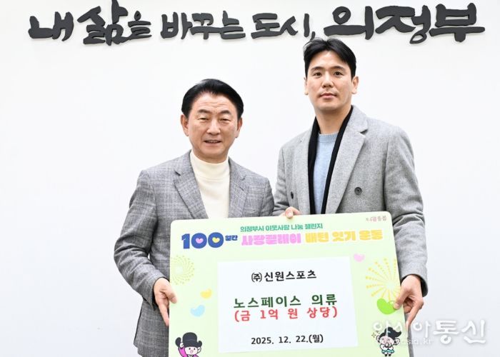 [아시아통신] 의정부시는 12월 22일 ㈜신원스포츠 노스페이스 양주점(LF스퀘어몰)과 포천송우점이 관내 아동복지시설에 아동용 의류 및 가방 등 1억 원 상당의 물품을 기부했다고 밝혔다.