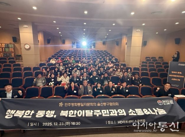 [아시아통신] 민주평화통일자문회의 울산동구협의회(회장 장예식)는 12월 23일 오후 4시 30분 HD아트센터 소공연장에서 북한이탈주민의 안정적인 지역 사회 정착을 지원하기 위하여 ‘북한이탈주민과의 소통 나눔’ 행사를 개최했다.